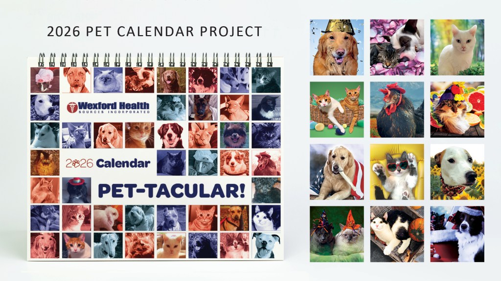 Wexford Health releases an annual calendar to their corporate office each year. For 2026 I chose to showcase employee’s pets by conducting a survey, and editing the winning photos.